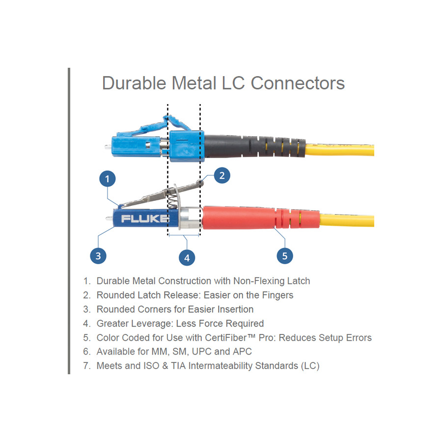 - Features Durable Fluke Metal LC connector with latching mechanism tested to 10,000 insertions