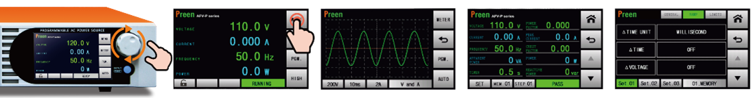 Any high performance AC source must provide a fast response time, low total harmonic distortion and tight voltage regulation. With the AFV-P series, you can easily simulate power line disturbance such as sags, surges, dropouts and spikes.
