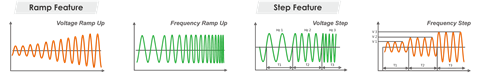 The Step and Ramp features let you define the slew rate of voltage and frequency at each step. Set the rise/fall time, time unit and voltage/frequency change between steps to create a wide range of waveforms. The Ramp feature can effectively reduce the inrush current by simulating soft start for motor or compressor startup.