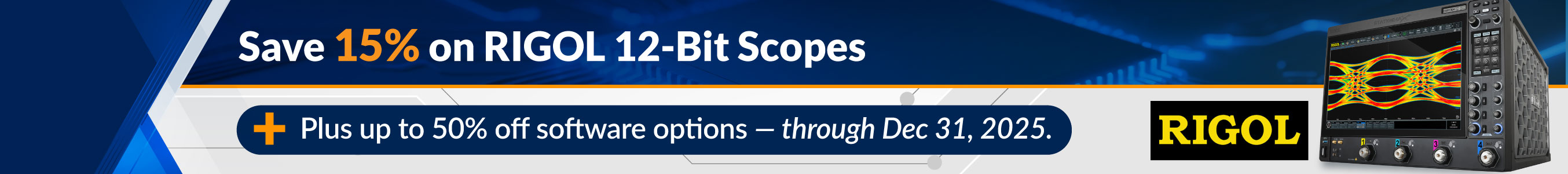 Unlock clearer signal insights and faster troubleshooting with RIGOL's 12-bit oscilloscopes—now 15% off. Plus, enhance your workflow with up to 50% off software options, giving you the tools to work smarter and get results faster. Don't miss this limited-time offer through December 31, 2025.