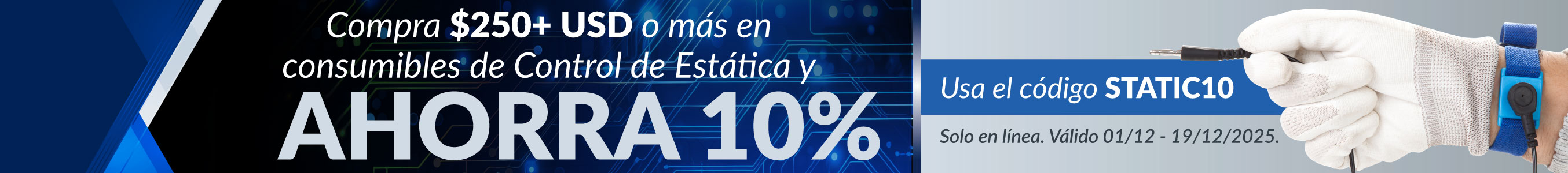 Compra $250 USD o más en consumibles de control de estática participantes entre el 01/12 al 19/12/25, luego ingresa el código STATIC10 al finalizar tu compra. El 10% de descuento se aplicará automáticamente en línea.